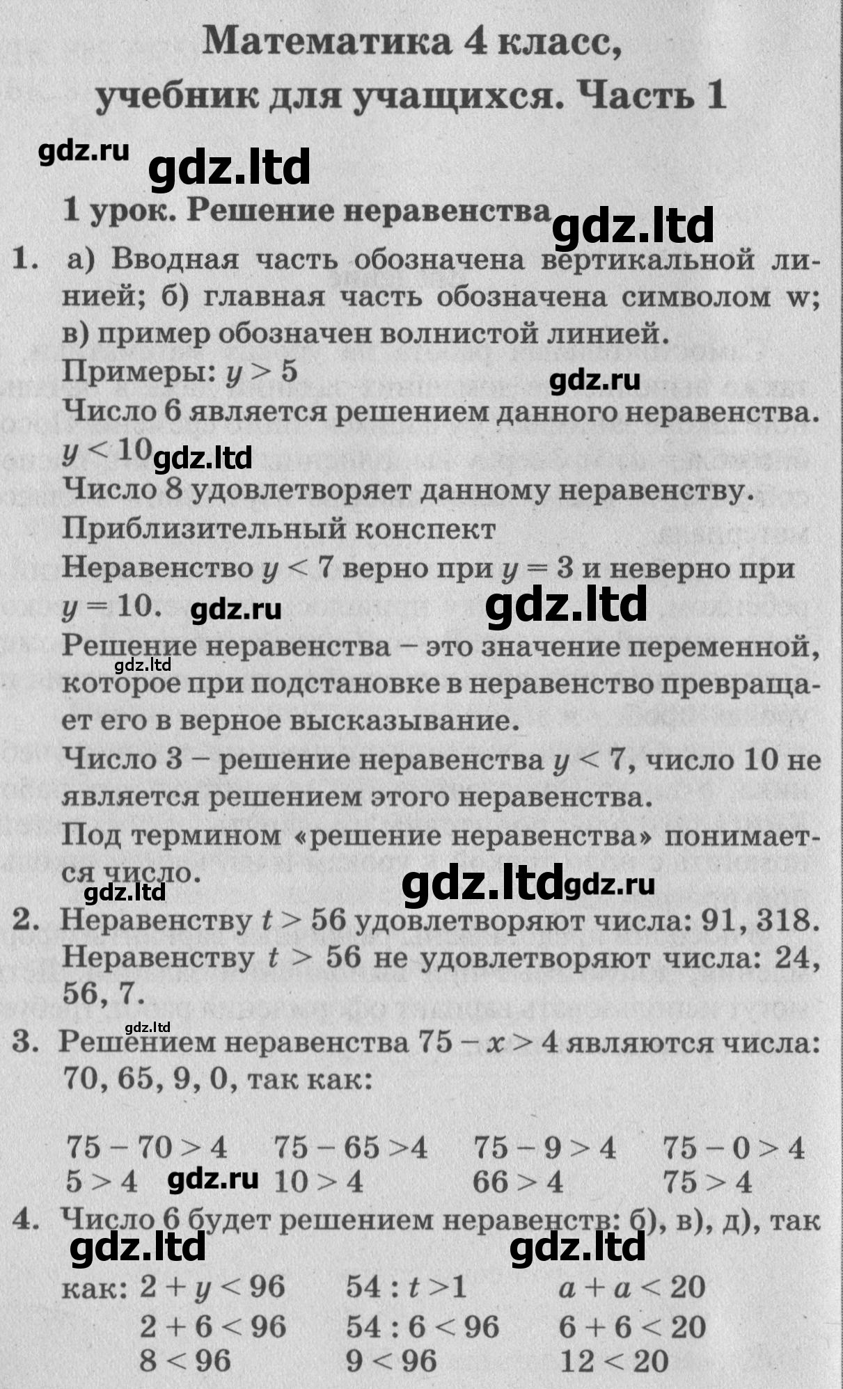 Сборник поделен на три части, которые в целом включают в себя восемьдесят девять уроков. Все ответы в ГДЗ по математике 4 класс тщательно проработаны и приведены в очень доступной форме. В конце пособия даны задания для повторения пройденного материала.